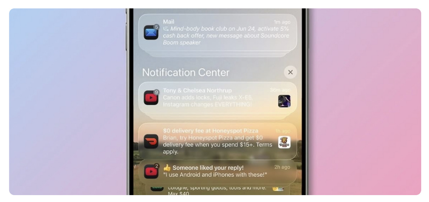 比如看郵件時,如果郵件內(nèi)容是純文字,玻璃背景會盡量 “隱身”,只保留淡淡的分層;如果郵件里有表格或圖片,背景會自動加強(qiáng)模糊,讓表格的邊框更清晰;就連收到推送時,通知欄的玻璃界面會比背景亮一點,既能提醒我 “有新消息”,又不會像扁平時代的彈窗那樣 “擋視線”。