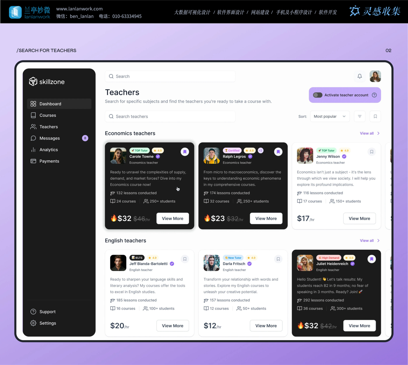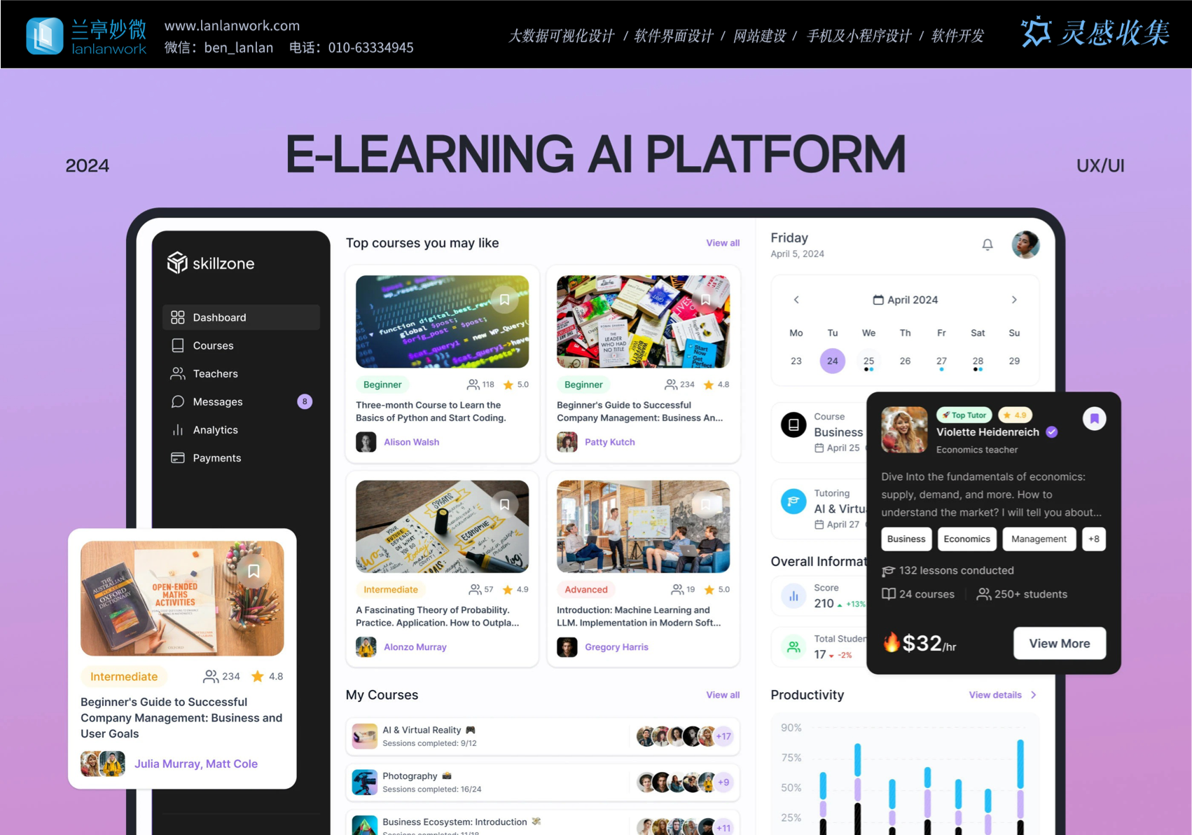 Skillzone 選用柔和的紫色為主色調(diào),紫色常給人智慧、有創(chuàng)造力的的感覺,很符合教育的特點。再搭配簡潔的黑白