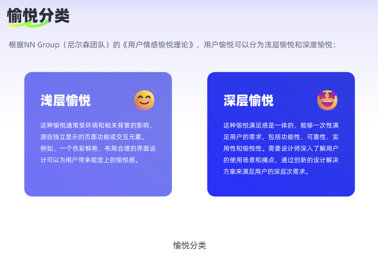 根據(jù)尼爾森團(tuán)隊(duì)的《用戶情感愉悅理論》,設(shè)計(jì)帶來的愉悅感分為兩種,二者的價(jià)值和實(shí)現(xiàn)方式截然不同,混淆它們很容易讓設(shè)計(jì) “浮于表面”。