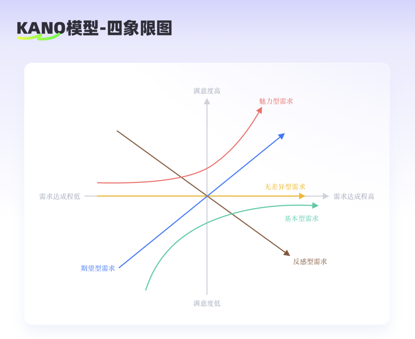 想做好愉悅感設(shè)計(jì),首先要明白:不是所有功能都能帶來愉悅,只有找對(duì) “用戶真正在意的需求”,才能避免 “費(fèi)力不討好”。東京理工大學(xué)狩野紀(jì)昭教授提出的 Kano 模型,能幫我們理清需求的優(yōu)先級(jí),找到愉悅感的發(fā)力點(diǎn)。