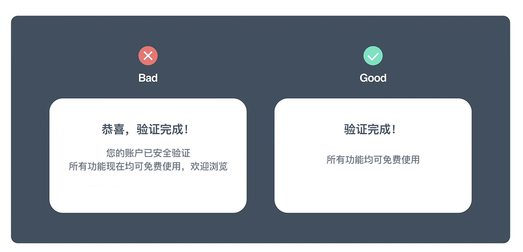 • 減字?jǐn)?shù):去掉不必要的形容詞和解釋。比如注冊成功提示,“恭喜您!注冊流程已全部完成,您的賬戶現(xiàn)在可以正常使用所有功能啦”,可簡化為 “注冊成功!所有功能已解鎖”,信息沒丟,讀起來更輕松。