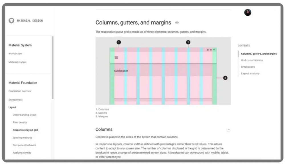 Material Design的柵格布局是響應(yīng)式的,能夠根據(jù)設(shè)備的屏幕大小和方向自動調(diào)整。設(shè)計師可以利用五個斷點(xs, sm, md, lg, xl)來定義在不同屏幕尺寸下的列數(shù)和布局方式,從而實現(xiàn)靈活的設(shè)計。