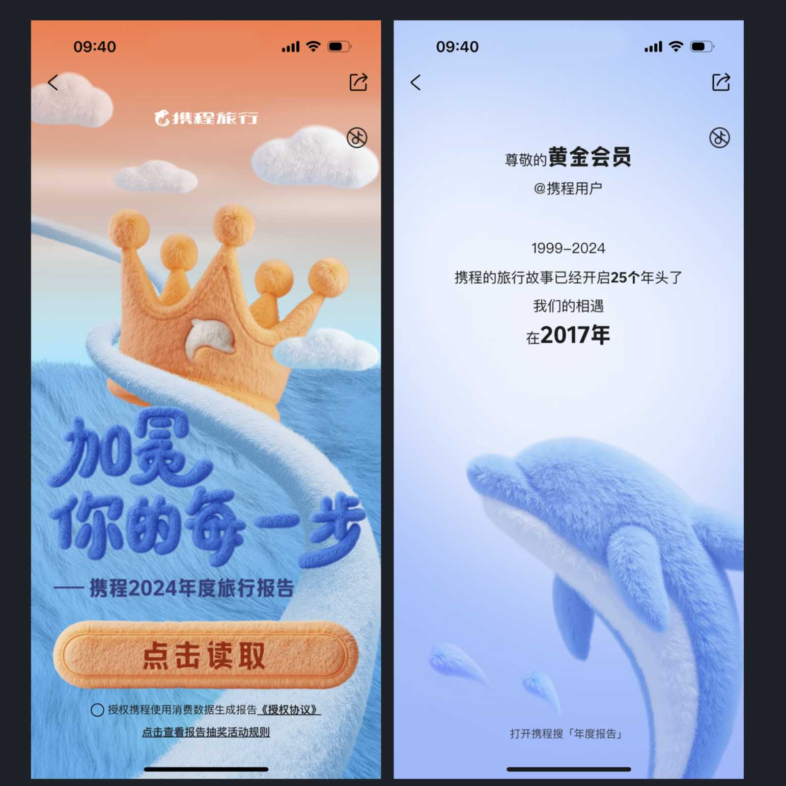 年度報告已成產(chǎn)品標(biāo)配,但想要讓人印象深刻,風(fēng)格化表達是關(guān)鍵。攜程旅行 2024 年度旅行報告以毛茸茸的設(shè)計語言,讓圖標(biāo)、字體、按鈕都透著柔軟質(zhì)感,在寒冬中給用戶帶來溫暖體驗。報告不僅呈現(xiàn)出行數(shù)據(jù),更通過 "加冕你的每一步" 的情感化文案,讓用戶在回顧旅程時收獲成就感,這種情感與風(fēng)格的雙重共鳴,讓分享欲自然提升。