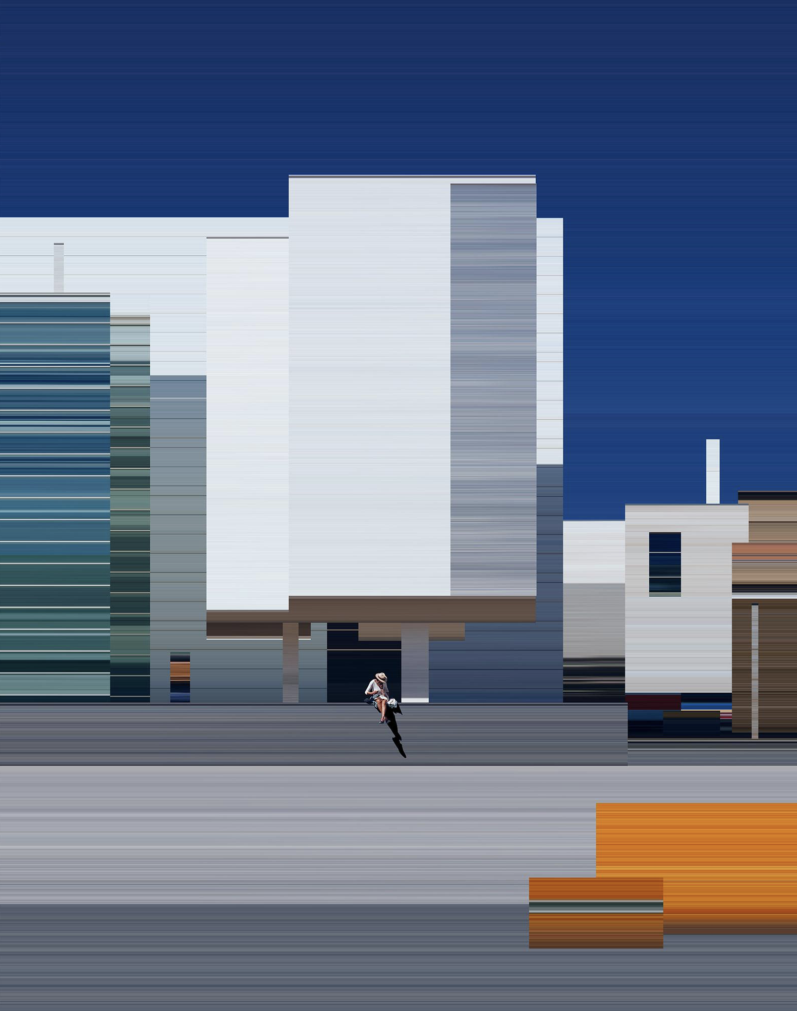 《時(shí)間拉伸》系列是一場(chǎng)關(guān)于感知邊界的探索,每一幅作品都構(gòu)建了一個(gè)超現(xiàn)實(shí)的視覺(jué)場(chǎng)域。藝術(shù)家以全球多個(gè)城市為拍攝背景,從繁華的都市街道到靜謐的自然角落,卻通過(guò) “拉伸時(shí)間” 的創(chuàng)作手法,將周圍的環(huán)境拆解、扭曲、重組。畫面中,中央人物始終保持著清晰、穩(wěn)定的姿態(tài),仿佛被按下了暫停鍵,脫離了時(shí)間的洪流;而背景中的建筑、街道、光影則被無(wú)限拉長(zhǎng)、模糊,化作流動(dòng)的色彩與線條,如同被時(shí)間的浪潮沖刷過(guò)的痕跡。