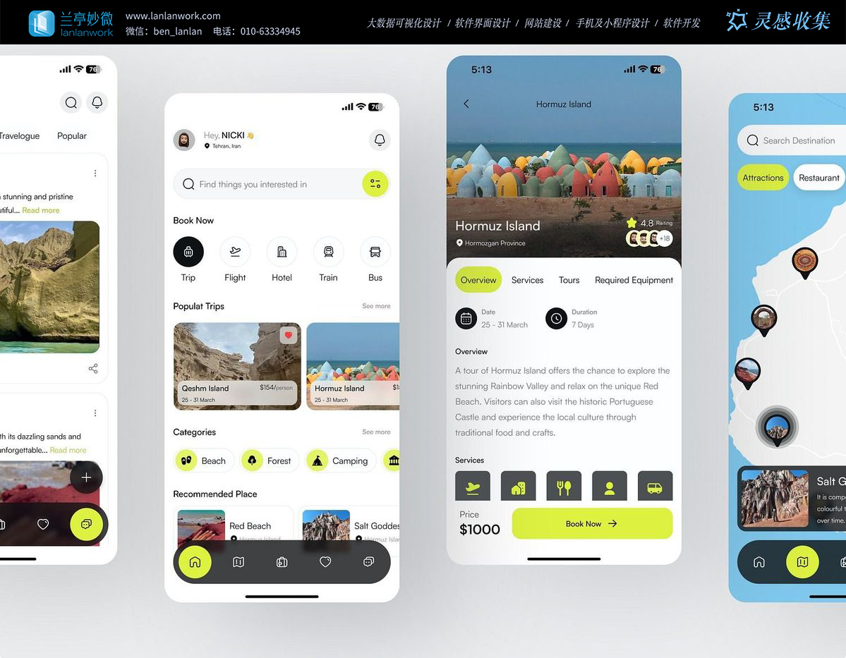 好的旅行 APP,從來不是冰冷的功能集合,而是 “旅行體驗的延伸”。這款 APP 的設(shè)計細節(jié)里,藏著對 “旅行情緒” 的精準(zhǔn)捕捉:比如 Hormuz Island 詳情頁的介紹文案,沒有堆砌 “必去”“絕美” 等形容詞,而是用 “explore the stunning Rainbow Valley”“relax on the unique Red Beach” 這樣的動詞短語,把 “向往感” 具象成可感知的畫面;底部的導(dǎo)航欄用柔和的圖標(biāo)替代了生硬的文字,“首頁”“行程”“收藏” 的功能區(qū)分,像把旅行的節(jié)奏 “握” 在了指尖。