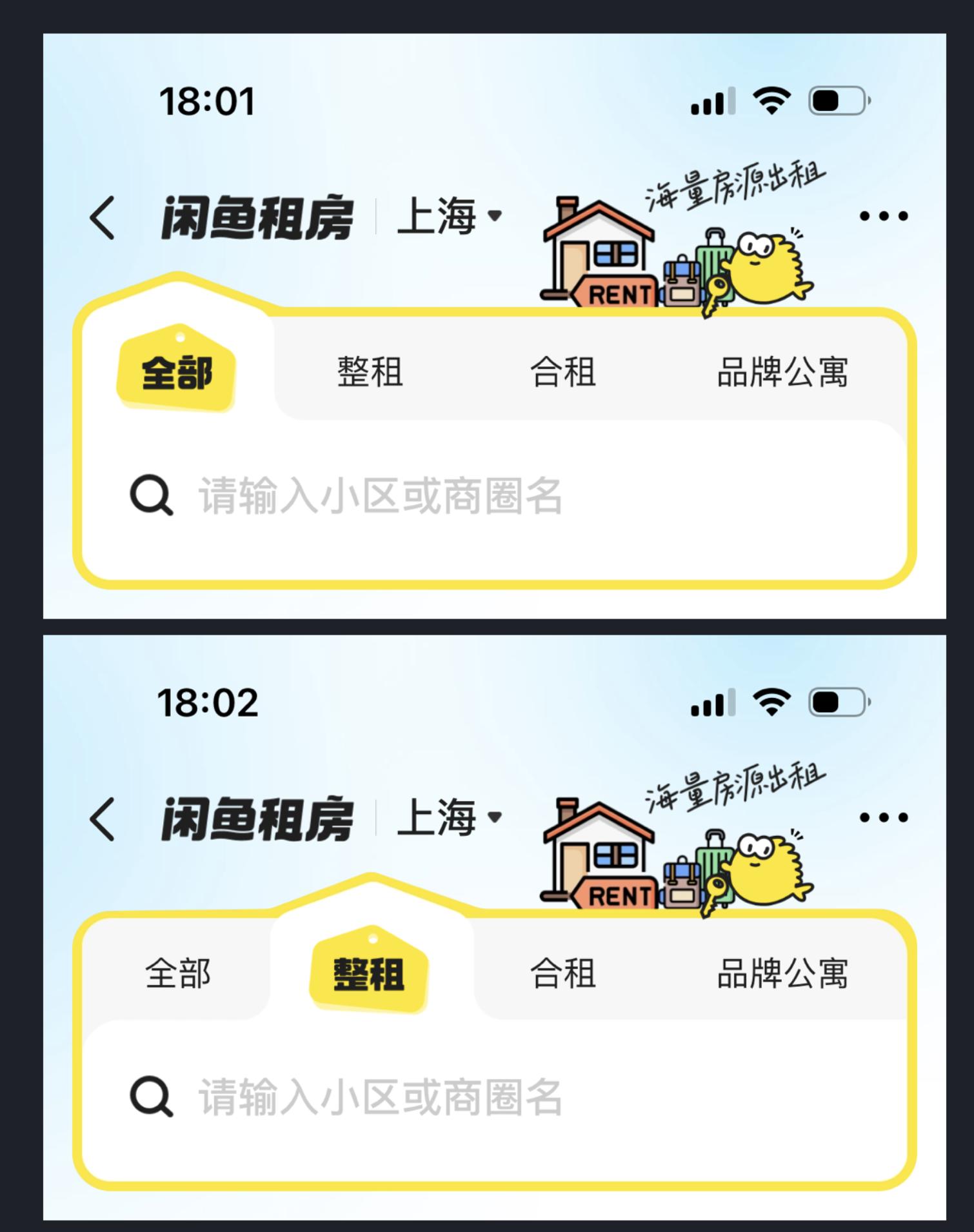 閑魚租房欄目的卡片設計便是典型,它摒棄了常規(guī)的矩形卡片框架,將房屋結構的輪廓融入卡片造型,用極簡的幾何圖形還原戶型特征,既貼合租房的業(yè)務核心,又讓卡片設計跳出了同質化的視覺桎梏。這種將業(yè)務特征與視覺設計結合的方式,不僅讓卡片更有辨識度,還能讓用戶一眼感知到功能屬性,實現(xiàn)了美觀與實用的雙重效果。