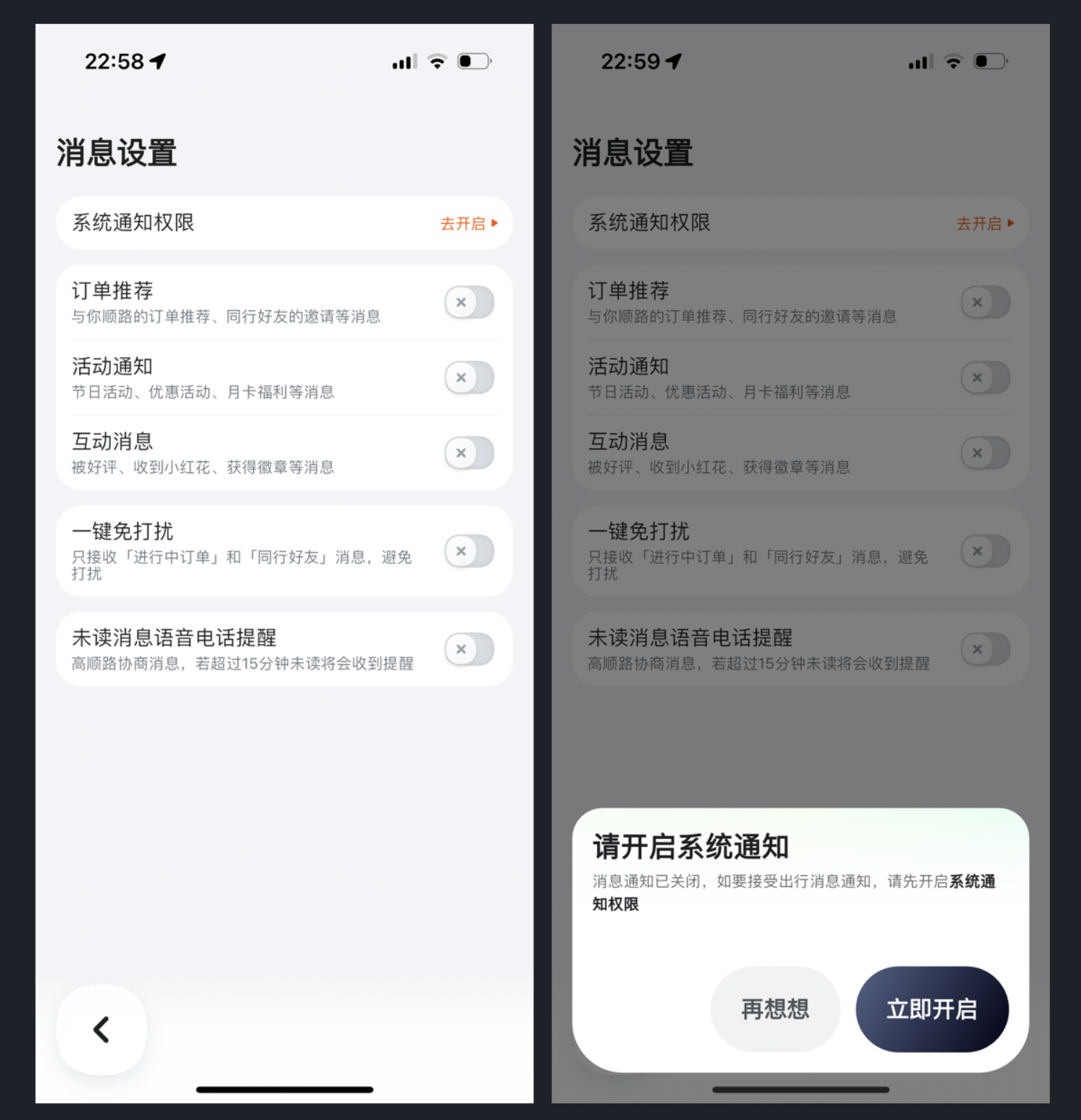 嘀嗒出行的消息設置設計就極具人性化,它沒有刻意弱化關閉按鈕,反而讓操作更直觀;同時為了避免消息過度干擾,特意設計了 “一鍵免打擾” 功能,讓用戶可自主選擇僅接收核心消息。這種設計摒棄了 “單向引導” 的思維,而是賦予用戶選擇權,既實現(xiàn)了引導開啟通知的核心目的,又兼顧了用戶的使用體驗,讓交互設計更有溫度。