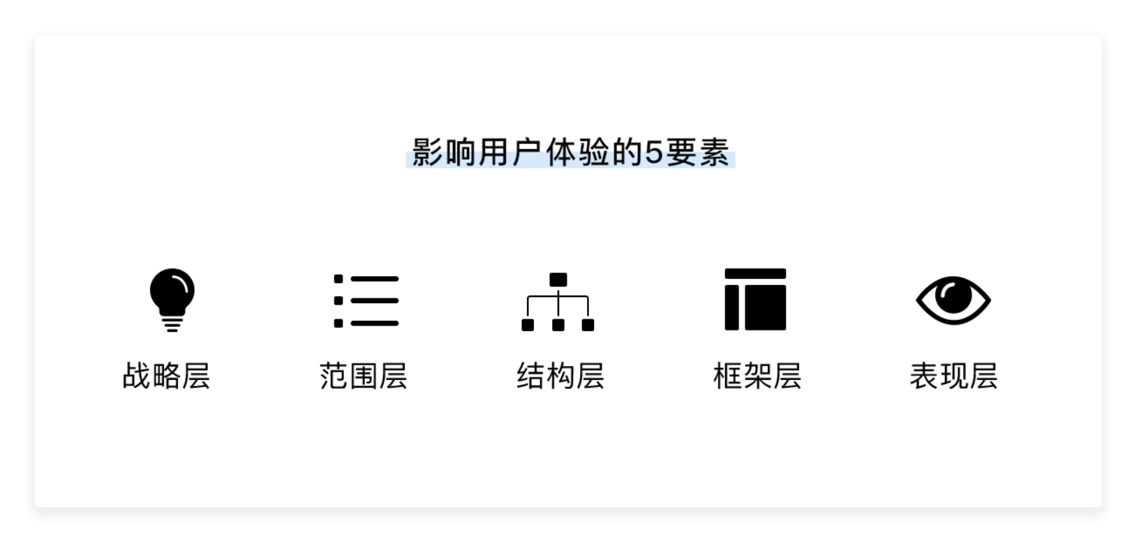 無論 UX 設(shè)計(jì)的形式如何變化,其核心框架始終圍繞《用戶體驗(yàn)要素》提出的戰(zhàn)略層、范圍層、結(jié)構(gòu)層、框架層、表現(xiàn)層五個(gè)層級(jí)展開。這五個(gè)層級(jí)從抽象到具體、從概念到落地,構(gòu)成了 UX 設(shè)計(jì)的完整邏輯體系,既是分析產(chǎn)品的工具,也是從 0 到 1 打造產(chǎn)品的核心方法論。