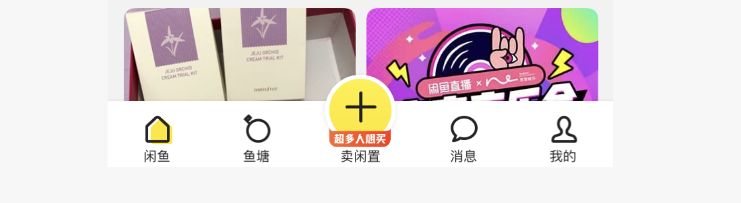 - 圖標(biāo) + 文字 + 駝式按鈕:核心亮點(diǎn)是通過駝式按鈕突出核心功能,引導(dǎo)用戶主動(dòng)操作,是社區(qū)類 APP的專屬設(shè)計(jì)樣式。如閑魚的底部 Tab 欄,以駝式加號(hào)按鈕突出 “賣閑置” 功能,有效調(diào)動(dòng)用戶的內(nèi)容發(fā)布積極性,提升社區(qū)活躍度。