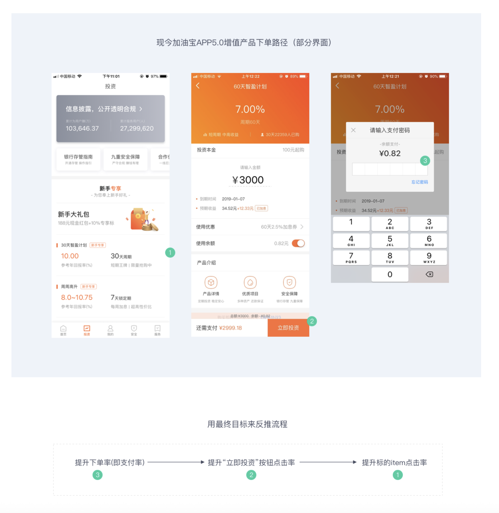 比如核心目標(biāo)是 “提升理財(cái)產(chǎn)品下單率”,蘭亭妙微會(huì)將其拆解為三個(gè)關(guān)鍵小目標(biāo),并反推出各環(huán)節(jié)的設(shè)計(jì)要點(diǎn):