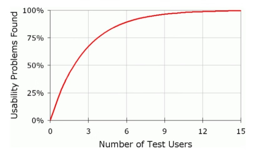 諸如此類的樣本數(shù)量“挑戰(zhàn)”,不勝枚舉。人機(jī)交互博士 Jakob Nielsen 曾提出:“有 5 個(gè)人參加的用戶測(cè)試,即可發(fā)現(xiàn)大多數(shù)(85%)的產(chǎn)品可用性問(wèn)題。” Nielsen 這張經(jīng)典圖表(如下圖)告訴我們答案:一般最嚴(yán)重的問(wèn)題都是前幾名用戶發(fā)現(xiàn)的,隨著用戶數(shù)量增多,發(fā)現(xiàn)問(wèn)題逐漸減少。