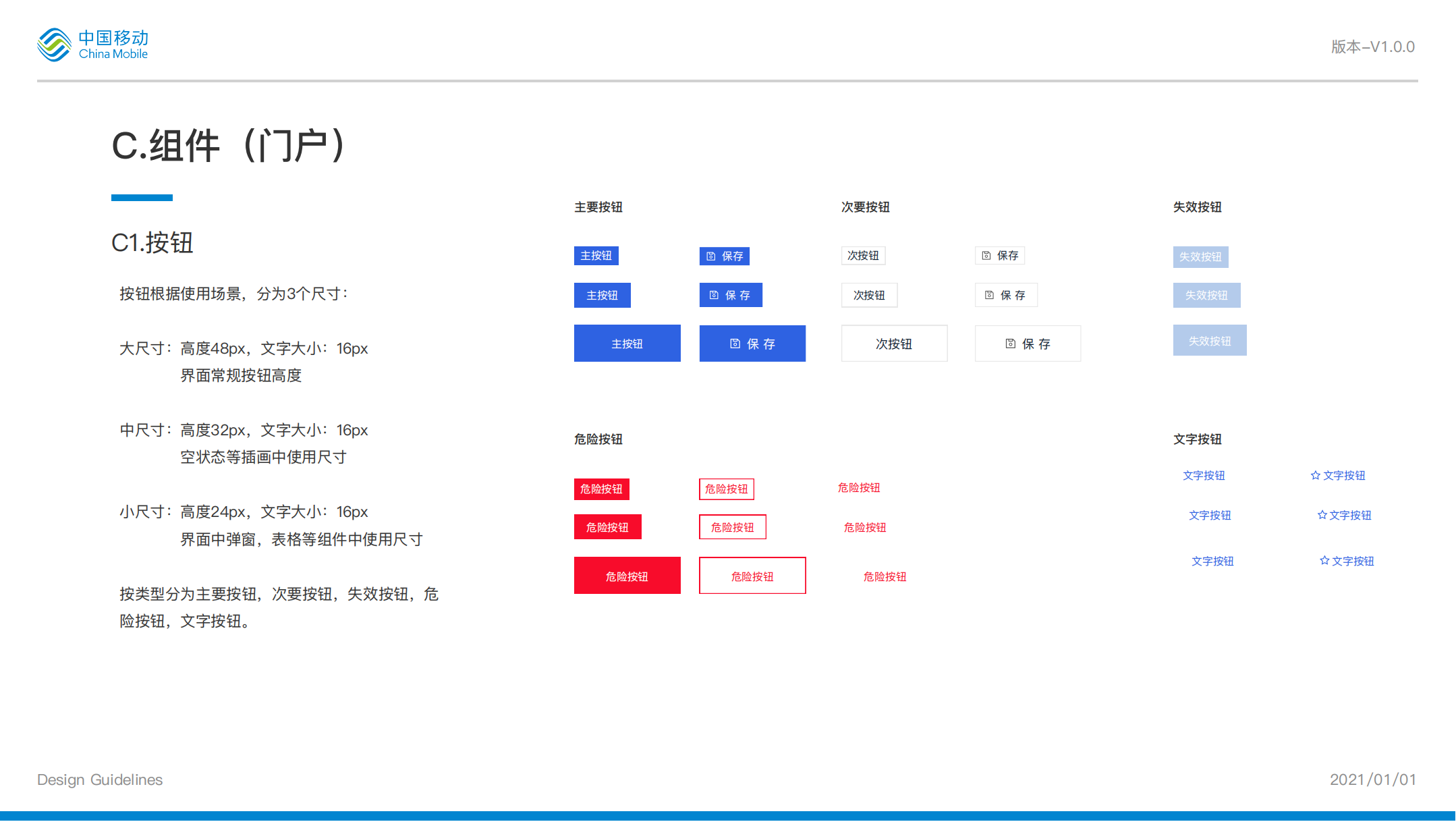 按鈕有 5 個狀態(tài):正常、點擊、懸停、加載、禁用。需要在規(guī)范中分別羅列出這五個狀態(tài),標(biāo)注上對應(yīng)的按鈕填充色、邊框色、圓角值、按鈕寬度和高度,按鈕文本大小、顏色值。如果是圖標(biāo)按鈕的話,除了上述參數(shù)值以外,還需要標(biāo)注 icon 和按鈕文本之間的間距,icon 圖標(biāo)的大小。