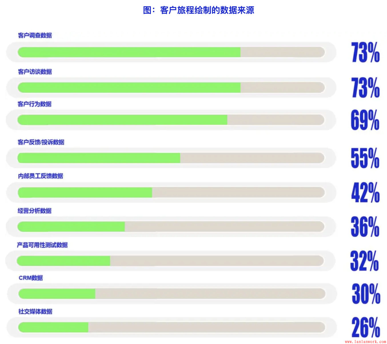 在繪制客戶旅程的過程中,目前主要用的是客戶調(diào)查數(shù)據(jù)和客戶訪談數(shù)據(jù),這也是客戶研究團(tuán)隊最擅長和最容易采集的數(shù)據(jù)。其次最常用的數(shù)據(jù)來源是客戶行為和客戶反饋/投訴數(shù)據(jù),總體上對外部數(shù)據(jù)應(yīng)用多于內(nèi)部數(shù)據(jù),對小數(shù)據(jù)多于大數(shù)據(jù)。