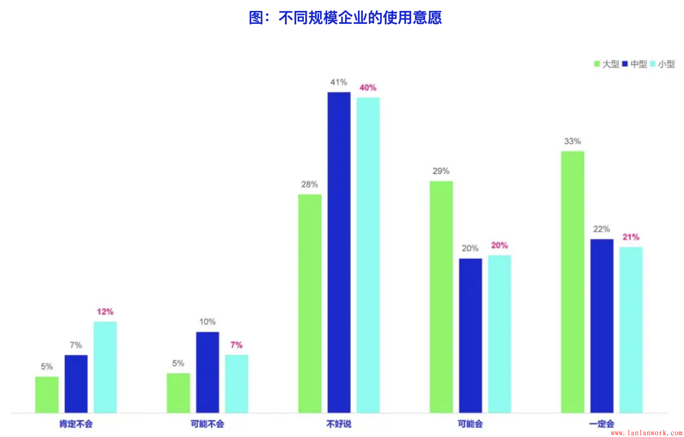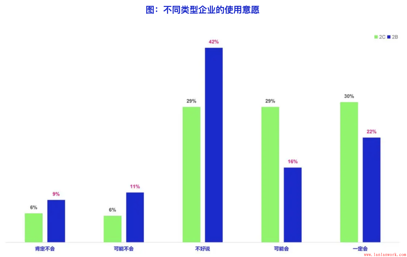不同類型的企業(yè)未來使用客戶旅程方法的可能性也存在明顯差異。使用客戶旅程越久、使用頻率越高,獲得的效果越好的企業(yè),繼續(xù)使用客戶旅程方法的傾向越高。2C企業(yè)比2B企業(yè)未來更愿意使用客戶旅程,雖然2B企業(yè)獲得效果更明顯,但2B企業(yè)使用客戶旅程的難度和成本更多到,導(dǎo)致2B企業(yè)的使用意愿要明顯低于2C企業(yè)。另外,相對于中型和小型企業(yè),大型企業(yè)的使用意愿明顯更高,表示可能會使用的比例達(dá)到了61%,明顯高出中小型企業(yè)。