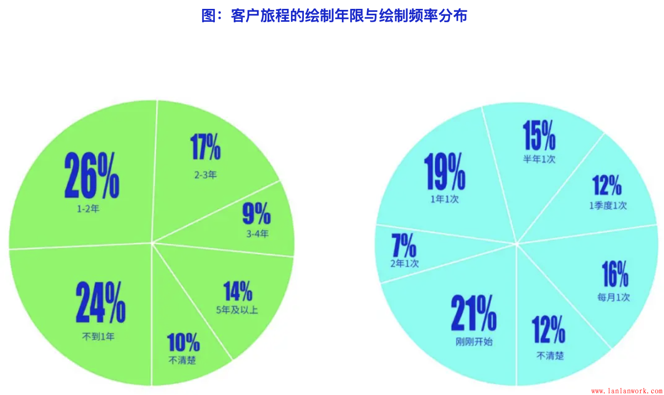 企業(yè)對客戶旅程總體的認(rèn)知與應(yīng)用比例為25%,屬于初期水平。2C類企業(yè)、大型企業(yè)、金融行業(yè)對客戶旅程的認(rèn)知和應(yīng)用水平明顯高于其他類型的企業(yè)。大多數(shù)企業(yè)在最近兩年才開始嘗試客戶旅程方法,主要由研究、設(shè)計、客服部門在主導(dǎo)客戶旅程的應(yīng)用,客戶旅程地圖的繪制頻率大部分是每年或半年繪制一次。