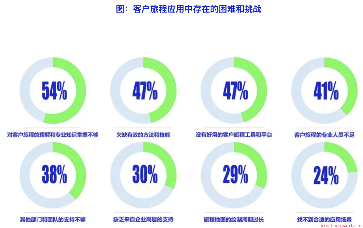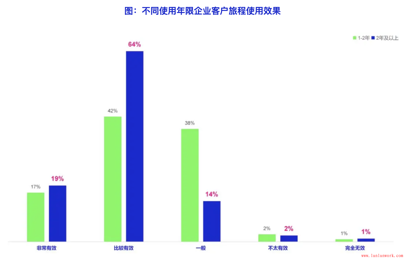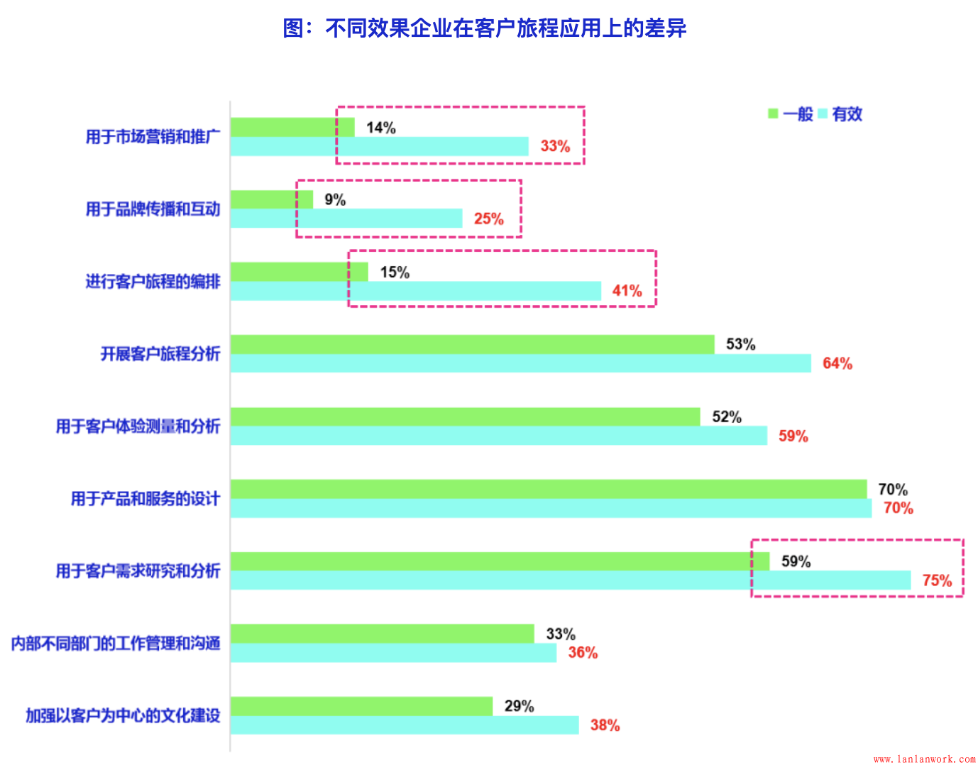 客戶旅程在不同領(lǐng)域的應(yīng)用對最終的效果有明顯的影響:表示客戶旅程應(yīng)用效果一般的企業(yè)在各個具體應(yīng)用領(lǐng)域的應(yīng)用比例均低于獲得明顯效果的企業(yè)。效果一般的企業(yè)在客戶需求研究和分析、客戶旅程編排、市場營銷和推廣,以及品牌傳播與互動方面的應(yīng)用差距最大(落后超過10%的比例)。從調(diào)查數(shù)據(jù)來看,雖然用于編排、營銷和品牌的總體比例不高,但確實影響最終應(yīng)用效果的顯著因素。