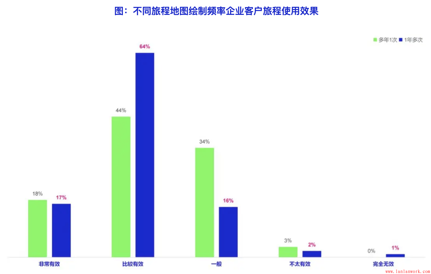 不同情況下,客戶旅程的應(yīng)用效果也不盡相同。調(diào)查數(shù)據(jù)顯示,使用客戶旅程方法時間越長,繪制客戶旅程地圖頻率越高,客戶旅程方法取得的效果越好。使用2年以上的企業(yè)和2年以下的企業(yè)表示有效的比例(包括“比較有效”和“非常有效”,下同)分別為83%和69%;每年繪制多次客戶旅程地圖的企業(yè)和多年繪制一次地圖的企業(yè)的表示有效的比例分別為81%和62%。