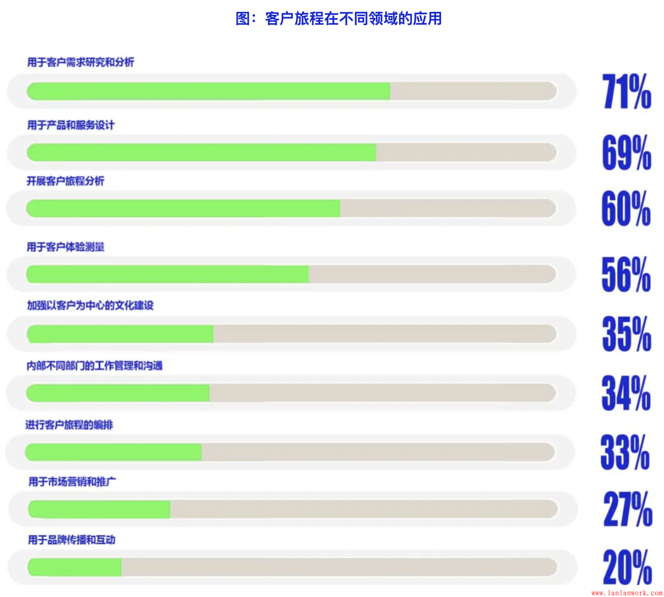 在將客戶旅程方法進(jìn)行具體應(yīng)用時,最常見是用于客戶需求分析、產(chǎn)品和服務(wù)設(shè)計、客戶旅程分析和測量。其次是在企業(yè)文化建設(shè)、工作管理和溝通方面的應(yīng)用。在具體操作層面,例如客戶旅程編排、營銷和互動,目前也有一定比例的具體應(yīng)用。隨著客戶旅程方法應(yīng)用的進(jìn)一步深入,直接到操作層面的應(yīng)用將逐步提升。