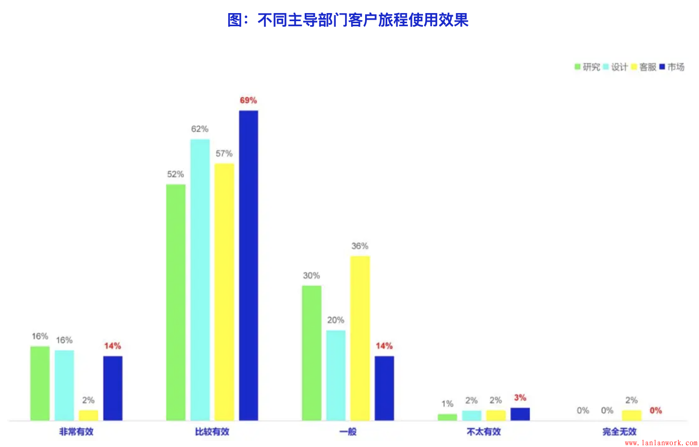 雖然目前由市場部門(包括營銷、銷售和品牌部門)主導(dǎo)的比例較少,但由市場部門主導(dǎo)客戶旅程應(yīng)用獲得效果明顯好于其他部門主導(dǎo)的情況,由客服部門主導(dǎo)的效果低于其他部門。這與MyCustomer在2018年在歐美的研究結(jié)論相反,這可能說明市場部門在客戶體驗領(lǐng)域的主導(dǎo)權(quán)在逐步上升。