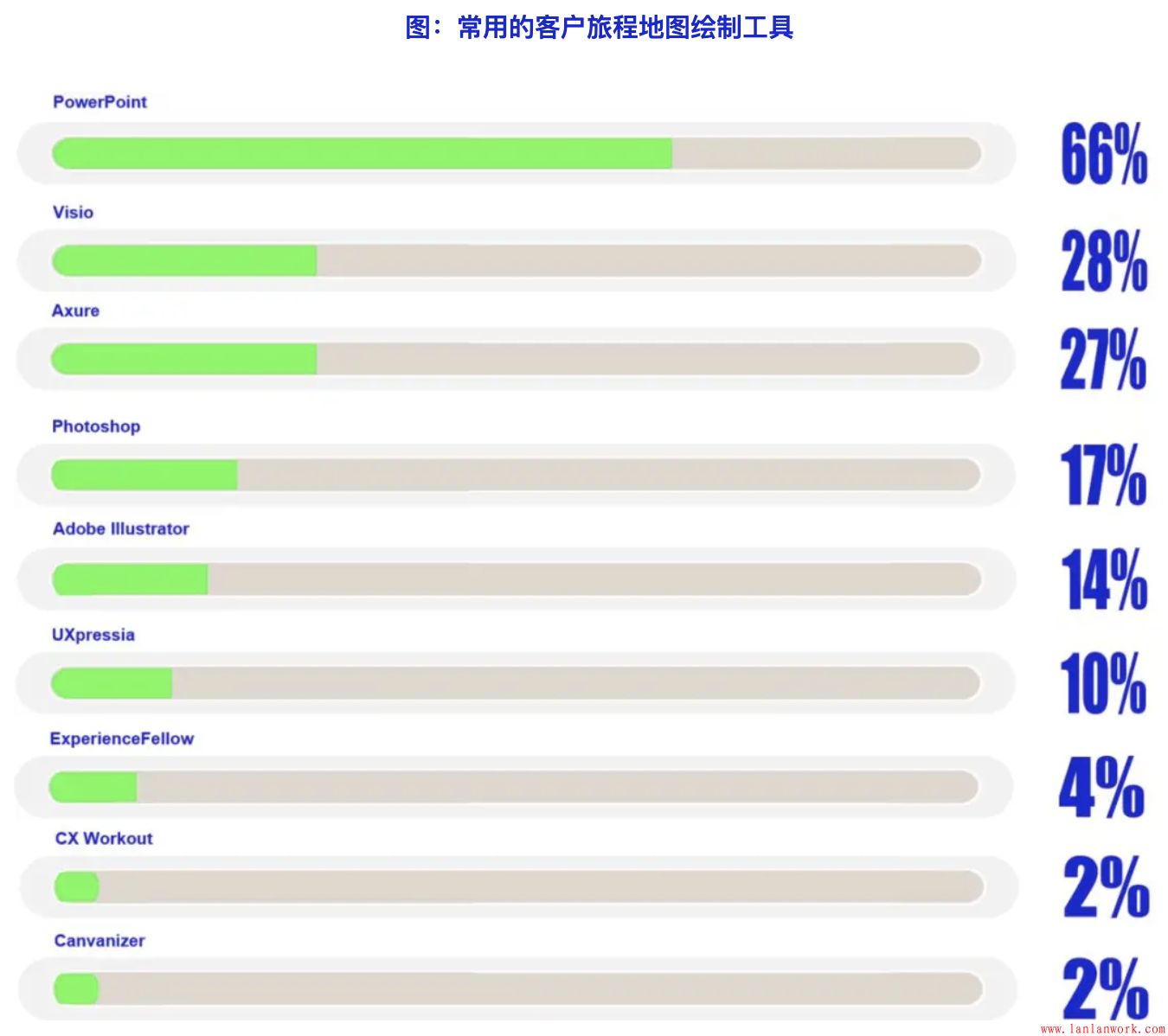 在客戶旅程地圖繪制工具方面,使用最多的是PowerPoint,處于絕對領(lǐng)先的地位;其次是常用的繪圖和設(shè)計工具,例如Visio、Photoshop、Adobe Illustrator等;專用的客戶旅程地圖繪制工作使用比例非常低,最主要的客戶旅程地圖專用繪制工具UXpressia的使用比例也只有10%,其他的則更低,使用比例只有2%-4%。主要是目前客戶旅程地圖繪制并不是一項常見工作,所以通用型的文編編輯和繪圖工具會是常用選擇,而目前的客戶旅程地圖繪制工具多為英文版本,國內(nèi)還沒有出現(xiàn)較好的客戶旅程地圖繪制工具,這也是客戶旅程地圖專用工具使用比例較低的重要原因。