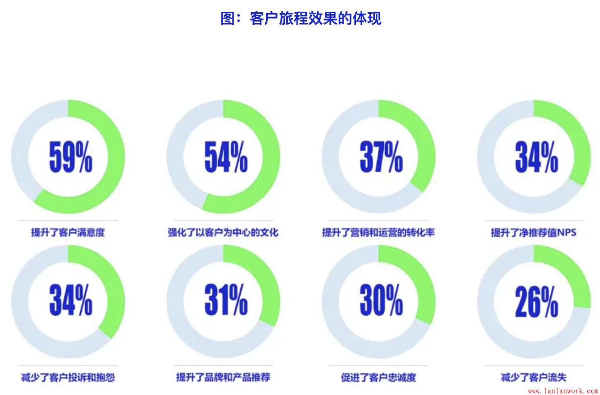 通過以上在不同領(lǐng)域的應(yīng)用,客戶旅程方法在各個方面的效果都有所體現(xiàn),尤其是在提升客戶滿意度、強化以客戶為中心的企業(yè)文化、提升營銷和運營的轉(zhuǎn)化率方面最為明顯,分別由59%、54%和37%的企業(yè)表示在這三個方面得到了提升。