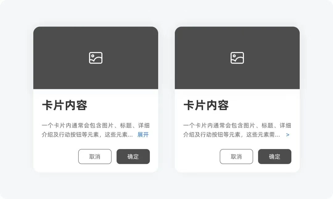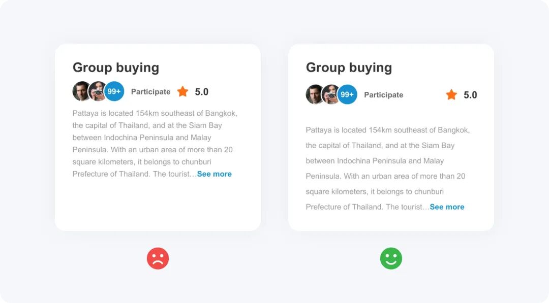 一個卡片內(nèi)通常會包含圖片、標題、詳細介紹及行動按鈕等元素,這些元素需要以聚焦的形式去呈現(xiàn),以幫助用戶快速掃描內(nèi)容。當文本內(nèi)容較長、展示的信息過多時,不利于用戶快速掃描,導致用戶無法在第一時間快速感知到產(chǎn)品想要展示的、或用戶想要知道的信息,很容易被用戶過濾。