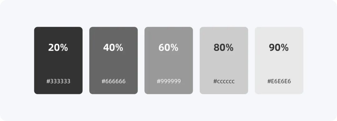 中性色即色彩中的黑白灰,設定中性色是由調(diào)整HSB(色相/飽和度/亮度)中的B值高低里形成一個表現(xiàn)視覺強弱的等級階梯,一般設定4~5個等級即可,例如B值的20%(#333333)、40%(#666666)、60%(#999999)、80%(#CCCCCC)、90%(#E6E6E6)。