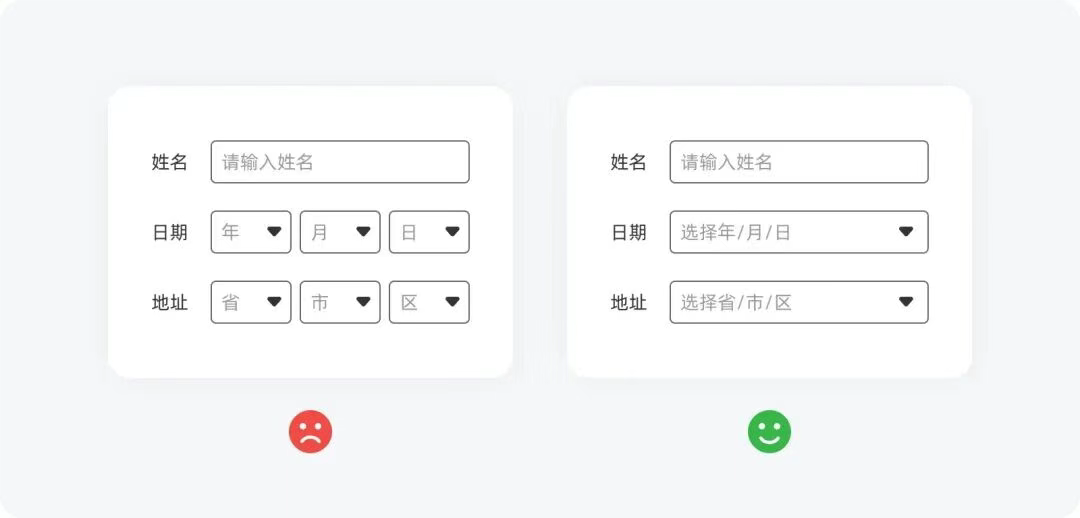 類似地址、日期這類層級內(nèi)容,不要將其分成多個字段,最好做成聯(lián)動選擇讓用戶一氣呵成。