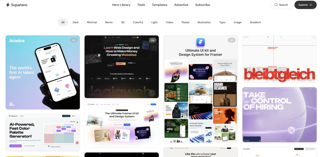 [Supahero](http://supahero.io) 專注于網(wǎng)站最重要的部分之一——英雄區(qū)(Hero Section)設計。這個區(qū)域通常是訪問者首先看到的部分,對于吸引用戶注意力至關重要。