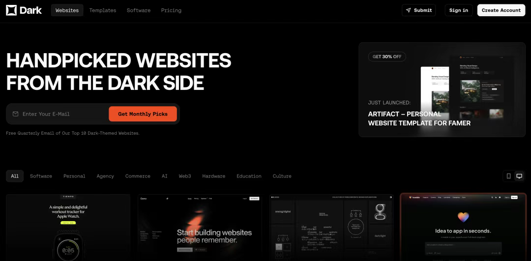 Dark Design 不僅提供整體網(wǎng)站設計靈感,還關注暗色模式下的細節(jié)處理,如色彩對比、可讀性和視覺層次,是設計暗色界面的絕佳參考資源。