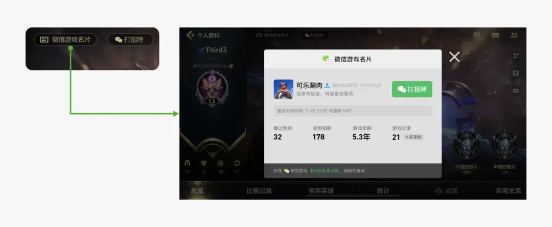 我對設(shè)計潛臺詞的思考,源于一次微信游戲名片的設(shè)計實踐。微信游戲名片的核心功能,是在游戲 APP 中展示玩家的游戲信息,為玩家間的社交搭建橋梁,讓不同游戲的玩家能便捷查看彼此的微信游戲數(shù)據(jù)。