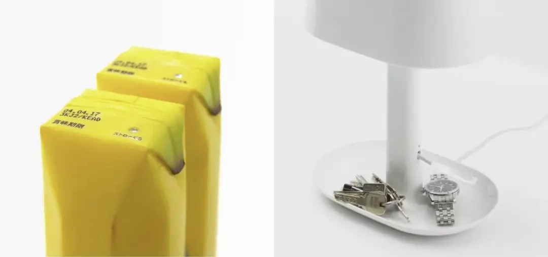深澤直人的兩個經(jīng)典設(shè)計,完美詮釋了這種潛臺詞:一款香蕉汁飲品,無需任何文字說明,僅憑香蕉造型的瓶身,就能讓用戶立刻知曉產(chǎn)品屬性,傳遞出 “這是香蕉汁” 的潛臺詞;一款臺燈的底座被設(shè)計成托盤造型,使用者會自然而然地將鑰匙、手表等隨身小物放置其上,因為底座的形態(tài)傳遞出 “可以盛放小物件” 的提示。