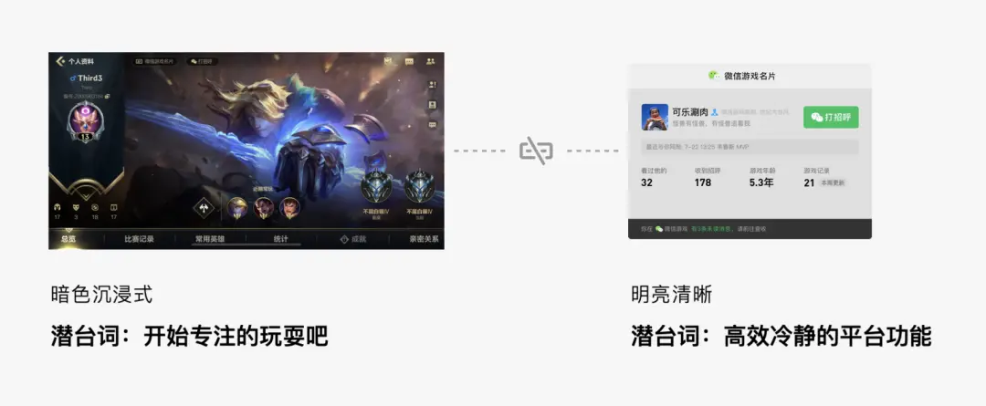 而最初的微信游戲名片,采用明亮清晰的設(shè)計風(fēng)格,其潛臺詞更偏向 “高效、冷靜的平臺功能工具”。游戲界面與名片界面的潛臺詞形成強(qiáng)烈反差,這正是用戶覺得違和、生硬的核心原因 —— 視覺潛臺詞的割裂,打破了玩家的游戲沉浸感。