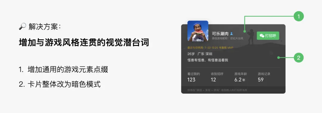 想要讓玩家的游戲與社交體驗無縫銜接,就需要讓游戲名片傳遞與游戲 UI 連貫的視覺潛臺詞?;诖耍覍υO(shè)計方案進(jìn)行了兩大優(yōu)化: