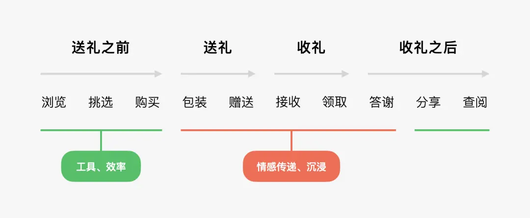 首先梳理禮品站的完整使用路徑,發(fā)現(xiàn)不同頁面的情感承載度差異顯著:一部分是挑選、購買道具的工具類頁面,核心需求是高效、便捷;另一部分是贈送、接收、拆禮物的核心頁面,核心需求是完成用戶的情感傳遞。顯然,后者是情感化設(shè)計的關(guān)鍵切入點。