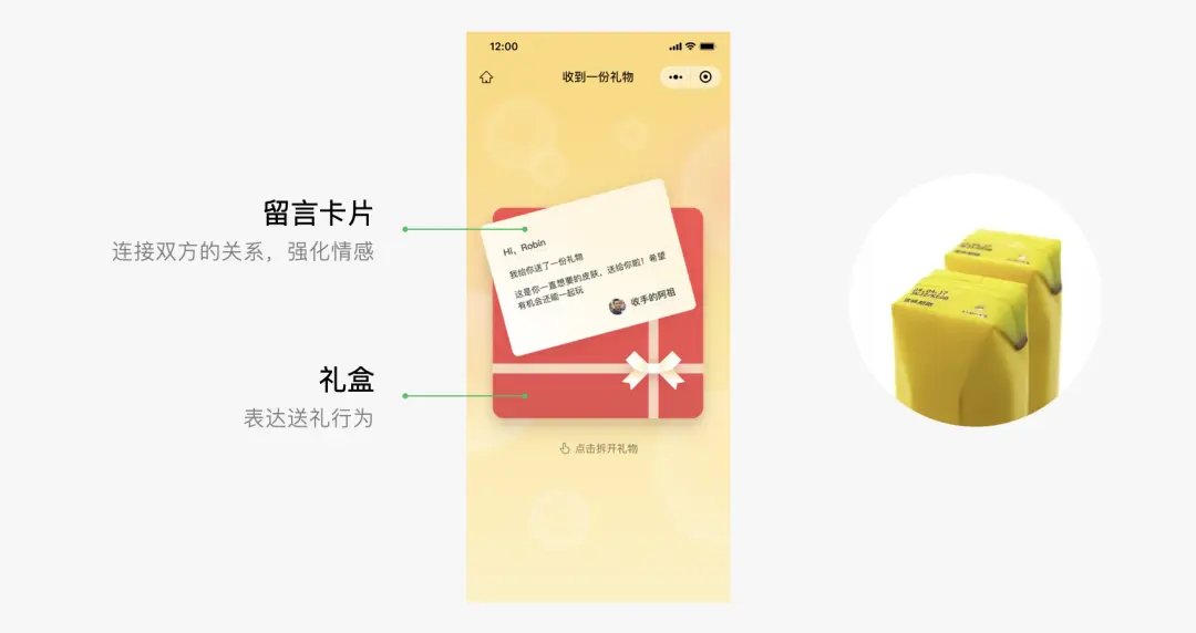 基于此,我將 “禮盒” 與 “留言卡片” 抽象為核心 UI 元素:禮盒直觀表達(dá) “送禮” 的行為,傳遞 “這是一份用心準(zhǔn)備的禮物” 的潛臺詞;寫有雙方昵稱與留言的卡片,連接起送禮者與收禮者的關(guān)系,強(qiáng)化情感共鳴。將這兩個元素融入核心的 “拆禮物” 頁面,即便用戶不看界面文字,也能立刻感知到 “有朋友為我送上了一份心意滿滿的禮物”,讓情感傳遞更直接、更動人。