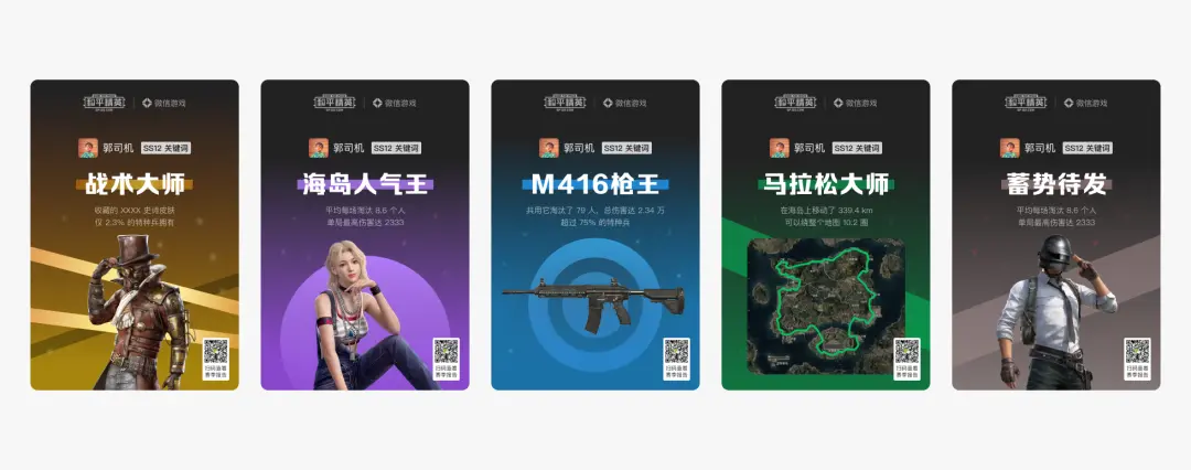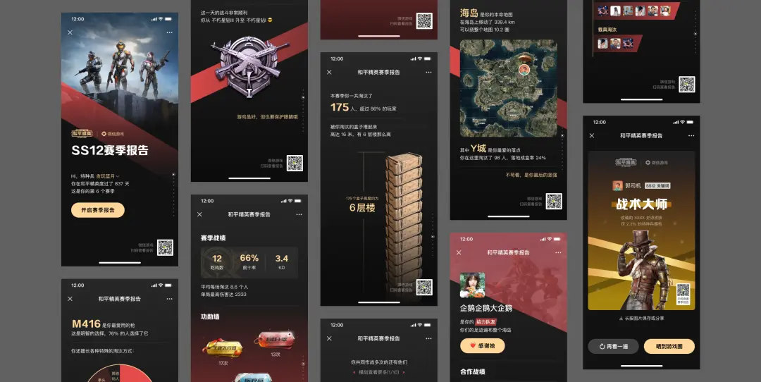 第三個案例,是和平精英 S12 賽季戰(zhàn)報的設(shè)計。賽季戰(zhàn)報的核心功能,是回顧玩家在賽季中的游戲表現(xiàn),而設(shè)計的核心挑戰(zhàn)是:如何將冰冷、復(fù)雜的游戲數(shù)據(jù),轉(zhuǎn)化為直觀、易懂的內(nèi)容,讓玩家能快速感知自身的游戲成果,進(jìn)而產(chǎn)生分享欲望。