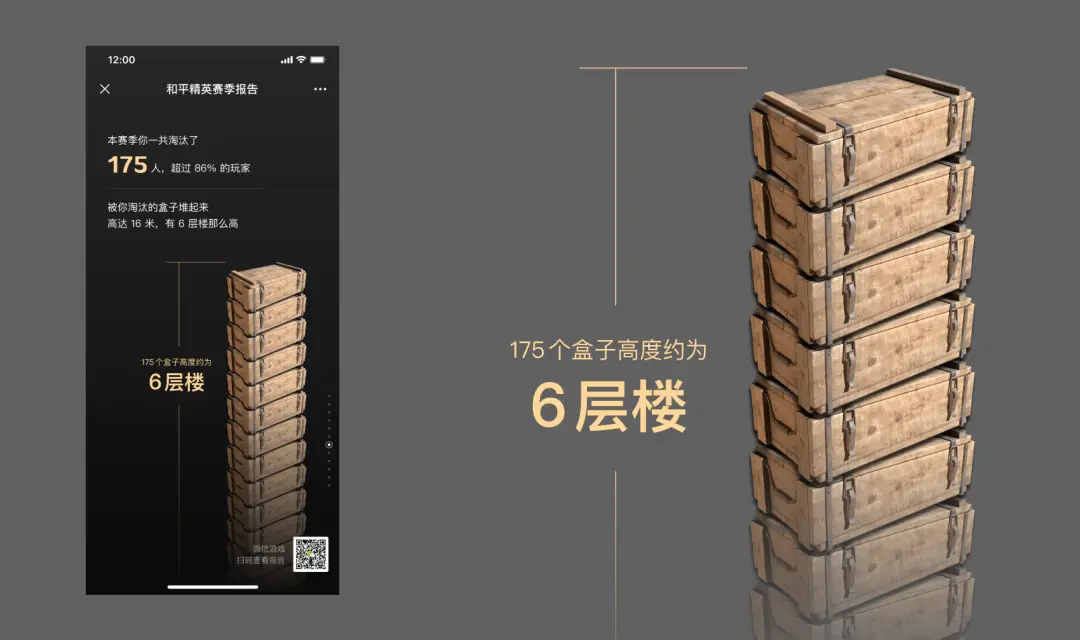 一是將 “擊殺人數(shù)” 具象為現(xiàn)實中的 “樓層高度”。和平精英中,被淘汰的玩家會變成存放裝備的小木盒,我們便將玩家賽季總擊殺數(shù),轉(zhuǎn)化為 “盒子堆疊的高度”—— 比如 “本賽季淘汰 175 人,盒子堆疊高達(dá) 16 米,相當(dāng)于 6 層樓的高度”,用現(xiàn)實中可感知的 “樓層高度”,讓玩家直觀感受到自己的擊殺成果,遠(yuǎn)比冰冷的數(shù)字更有沖擊力。