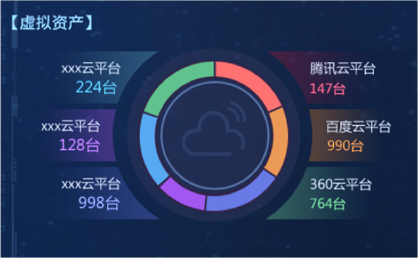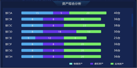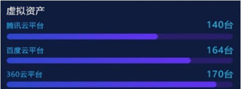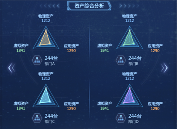 “資產(chǎn)綜合分析”模塊,以部門為單位,對企業(yè)“物理資產(chǎn)”“虛擬資產(chǎn)”“應(yīng)用資產(chǎn)”數(shù)量統(tǒng)計分析,并展示各部門內(nèi)不同資產(chǎn)類型的比例關(guān)系和總量。在設(shè)計版本中,我們改變模塊內(nèi)的布局和交互方式,以雷達(dá)圖方式展示部門內(nèi)部不同資產(chǎn)類型的數(shù)量關(guān)系和總量,并通過顏色來區(qū)分不同部間的數(shù)據(jù)。內(nèi)容擴展性方面,采用左右橫向翻頁樣式,可自由設(shè)定系統(tǒng)自動翻頁切換和手動點擊切換,不僅豐富了頁面展示方式,又增加交互趣味性,數(shù)據(jù)切換過程中動效的使用也進(jìn)一步增加界面的科技感和“數(shù)據(jù)之美”。