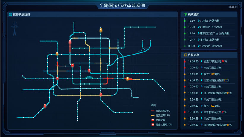 布局左右按照黃金分割線(xiàn)進(jìn)行分割布局,地鐵線(xiàn)路圖通過(guò)圖標(biāo)和顏色區(qū)分狀態(tài),使用戶(hù)直觀了解各站客流數(shù)據(jù)和告警信息,右側(cè)模式通知和告警信息實(shí)時(shí)滾動(dòng)彈出相對(duì)應(yīng)預(yù)警和通知信息,紅黃色點(diǎn)讓用戶(hù)第一眼就知道發(fā)生狀況的緊急程度。