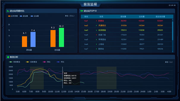 按設(shè)備狀態(tài)、客流、運(yùn)行模式分時(shí)段切換綜合顯示;按線(xiàn)、站異常彈出形式顯示異常信息;